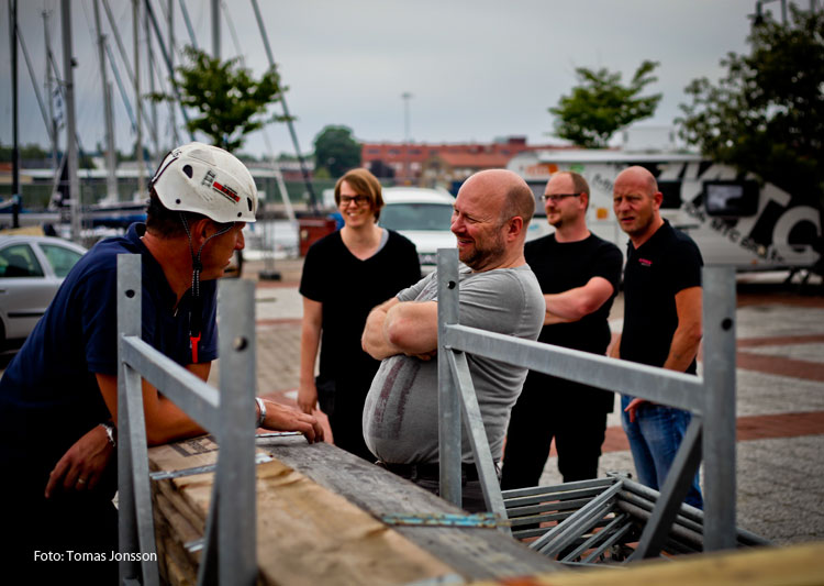 | Roddarna lossar utrustning till scenen – notera bh:n som verkade följa lådan. |